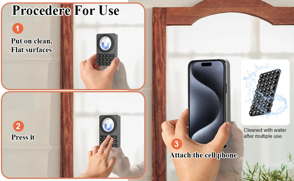 Notre support magnétique silicone se fixe sur votre téléphone sur toute surface lisse : miroirs de vanité, fenêtres en verre, écrans d'ordinateur, réfrigérateurs, carrelages, etc. Compatible avec toutes les marques de téléphones mobiles : iPhone, Galaxy, Google, HTC, etc.
